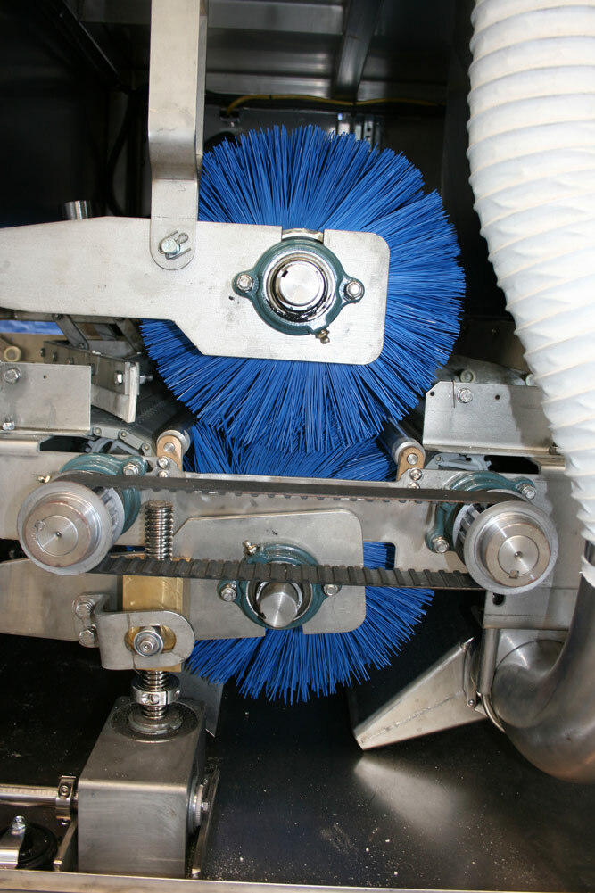 - Brushing cabinet featuring dual counter rotating brushes to loosen debris from the top and sides of the pan