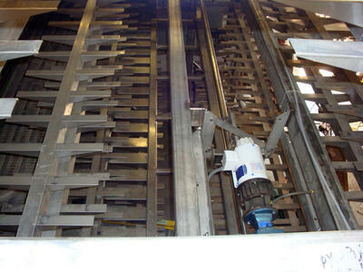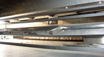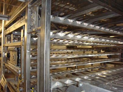 Tray coolers mechanically are similar to the tray proofer and can be designed for conditioned or ambient cooling environments. The Henry Group's bakery tray coolers can easily accommodate changes in pan sizes. These bread tray racks are designed as an integral part of a fully automated line. They also benefit from the ability to utilize space efficiently. The design variations allow the bakery tray cooler to be built over the top of existing equipment such as ovens or to be fully floor-mounted. Tray coolers can be located on a different floor of the bakery and discharge and load on another floor. The tray circuit is a flexible design and lends itself to difficult space configurations when other coolers may not be an option.